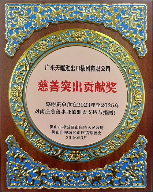 2026年3月,天耀集团收到佛山市禅城区南庄镇人民政府、佛山市禅城区南庄镇慈善会联合授予的“慈善突出贡献奖”,以表彰公司在2023年至2025年期间,对南庄慈善事业的鼎力支持与无私捐赠,这份荣誉既是对企业公益初心的肯定,更是对其社会责任担当的褒奖。